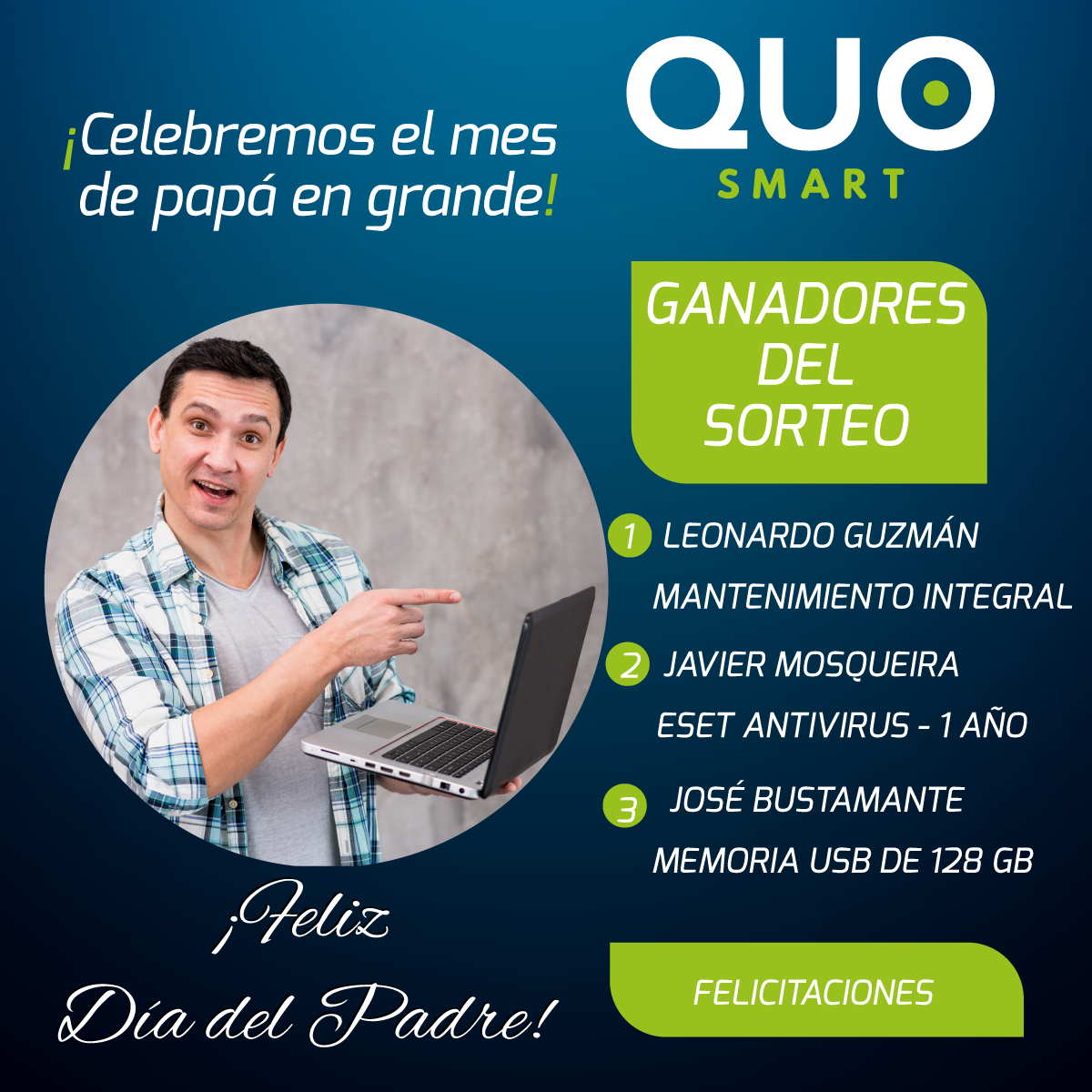 ¡Felicitaciones a los ganadores del sorteo del mes de papá con QUO Smart! Nos complace anunciar a los afortunados ganadores de nuestros premios exclusivos. ¡Han sido seleccionados entre muchos participantes y ahora podrán disfrutar de los siguientes premios: 1er Lugar: Leonardo Guzmán: ¡Felicidades, Leonardo! Te has llevado un servicio de mantenimiento integral para tu Laptop o PC. Nuestro equipo de expertos se encargará de optimizar y mejorar el rendimiento de tu dispositivo, para que puedas disfrutar de una experiencia informática excepcional. 2do Lugar: Javier Mosqueira: ¡Felicidades, Javier! Has ganado una licencia de antivirus por 12 meses. Esta herramienta te permitirá proteger tus dispositivos y mantener a salvo tu valiosa información mientras navegas por la web con total tranquilidad y confianza. 3er Lugar: José Bustamante: ¡Felicidades, José! Te llevas una memoria USB de 128 GB. Ahora podrás almacenar todos tus recuerdos y archivos valiosos en este dispositivo de alta capacidad.